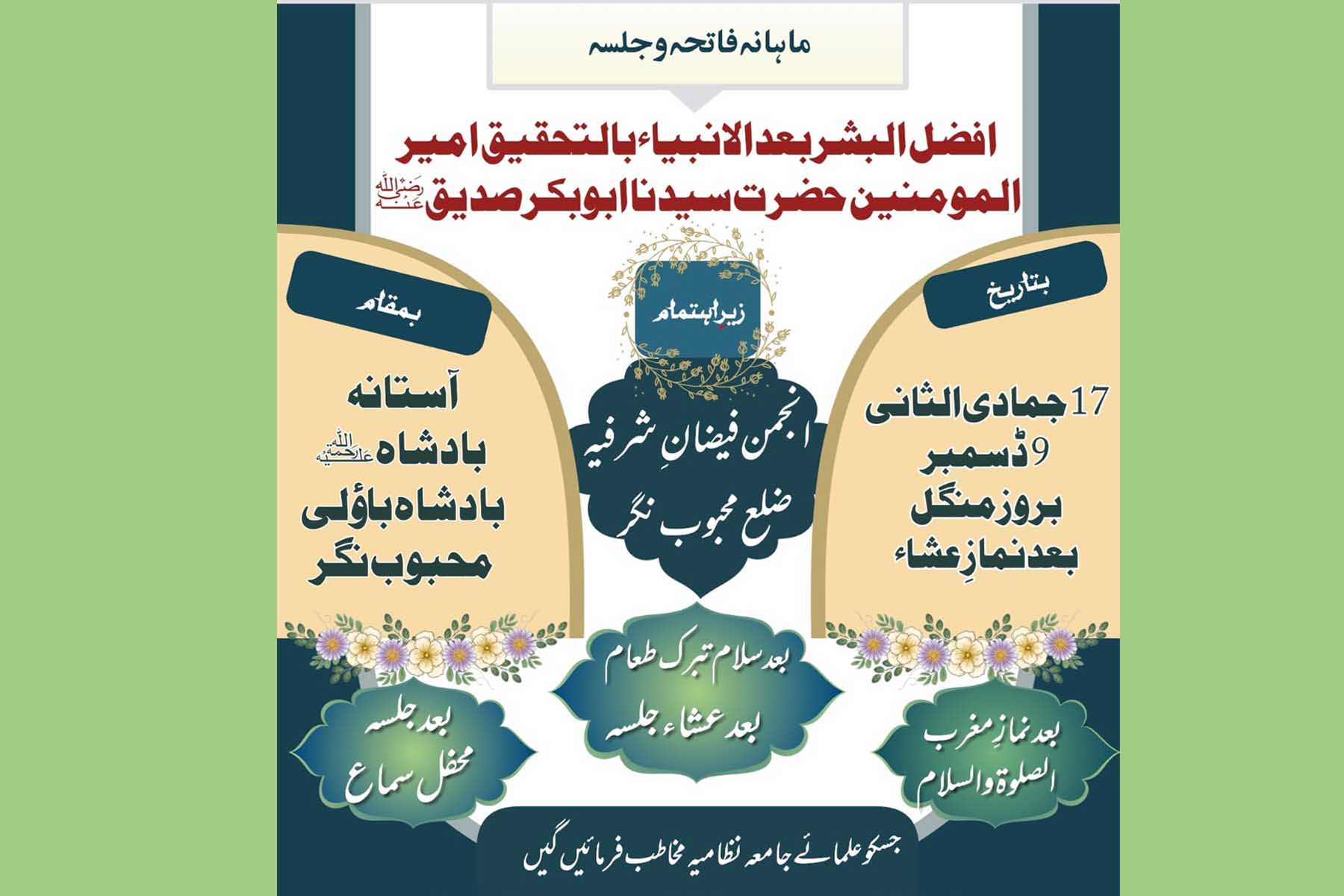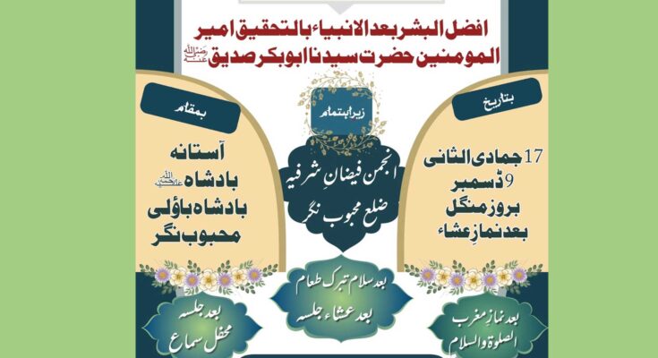 حافظ محمد وارث پاشاہ قادری سجادہ نشین حضرت اتم شرفیؒ کی اطلاع کے بموجب ماہانہ فاتحہ 09 دسمبر بروز منگل بعد نماز عشاء جلسہ افضل البشر بعدالانبیاء بالتحقیق خلیفۃ الرسول اللہؐ امیرالمومنین حضرت سیدنا ابوبکر صدیق ؓ زیر اہتمام انجمن فیضان شرفیہ ضلع محبوب نگر بمقام درگاہ شریف تاج العارفین قطبِ محبوب نگر حضرت سید شاہ برہان محبوب سہروردی المعروف حضرت برہنہ بادشاہ ؒ بادشاہ باولی محبوب نگر مقرر ہے ۔