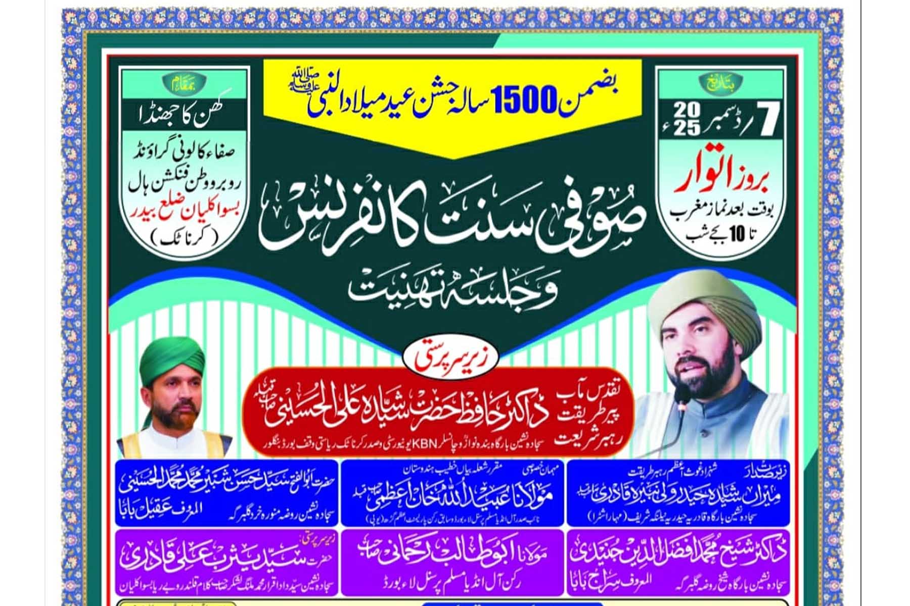 حضرت سید شاہ حیدر ولی اللہ نبیرہ قادری سجادہ نشین درگاہ حضرت حیدر ولی اللہ نبیرہ قادری المعروف دادا پیر رحمتہ اللہ علیہ، نیلنگہ مہاراشٹر، و جناب سید یثرب علی قادری سجادہ نشین درگاہ حضرت سید دادا قرارمحمد ملنگ لشکر صاحب کلام قلندر و بے ریا بسوا کلیان نے ایک پر یس نوٹ جاری کر کے اطلاع دی ہے کہ کرناٹک کے ضلع بیدر کے تعلقہ بسواکلیان شریف میں 7 ڈسمبر 2025ء بروز اتوار بعد نماز مغرب بمقام کن کا جھنڈا، الصفاء کالونی، رو برو وطن فنکشن ہال میں ایک عظیم الشان پیمانے پر 1500 سالہ عید جشن میلاد میلاد النبی ﷺ کے ضمن میں ایک صوفی سنت کانفرنس کا انعقاد عمل میں لایا جا رہا ہے۔ یہ 1500 سالہ جشن اس سے قبل گلبرگہ شریف، را پچور، ہبلی اور کو پل جیسے شہروں میں منا یا جا چکا ہے۔ اب کی بار بسواکلیان میں یہ جشن ہوگا ان شاء اللہ۔