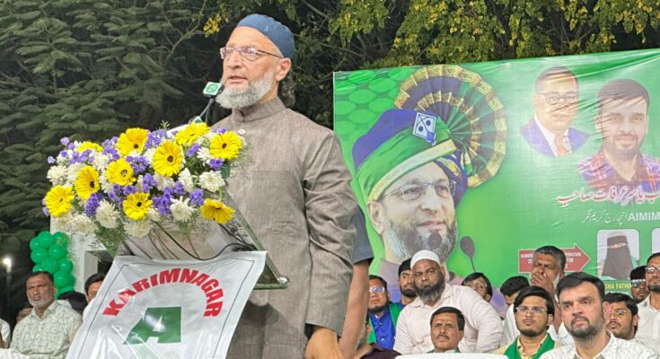 All India Majlis-e-Ittehadul Muslimeen President Barrister Asaduddin Owaisi addresses an election rally at Suraksh Ground, Karimnagar