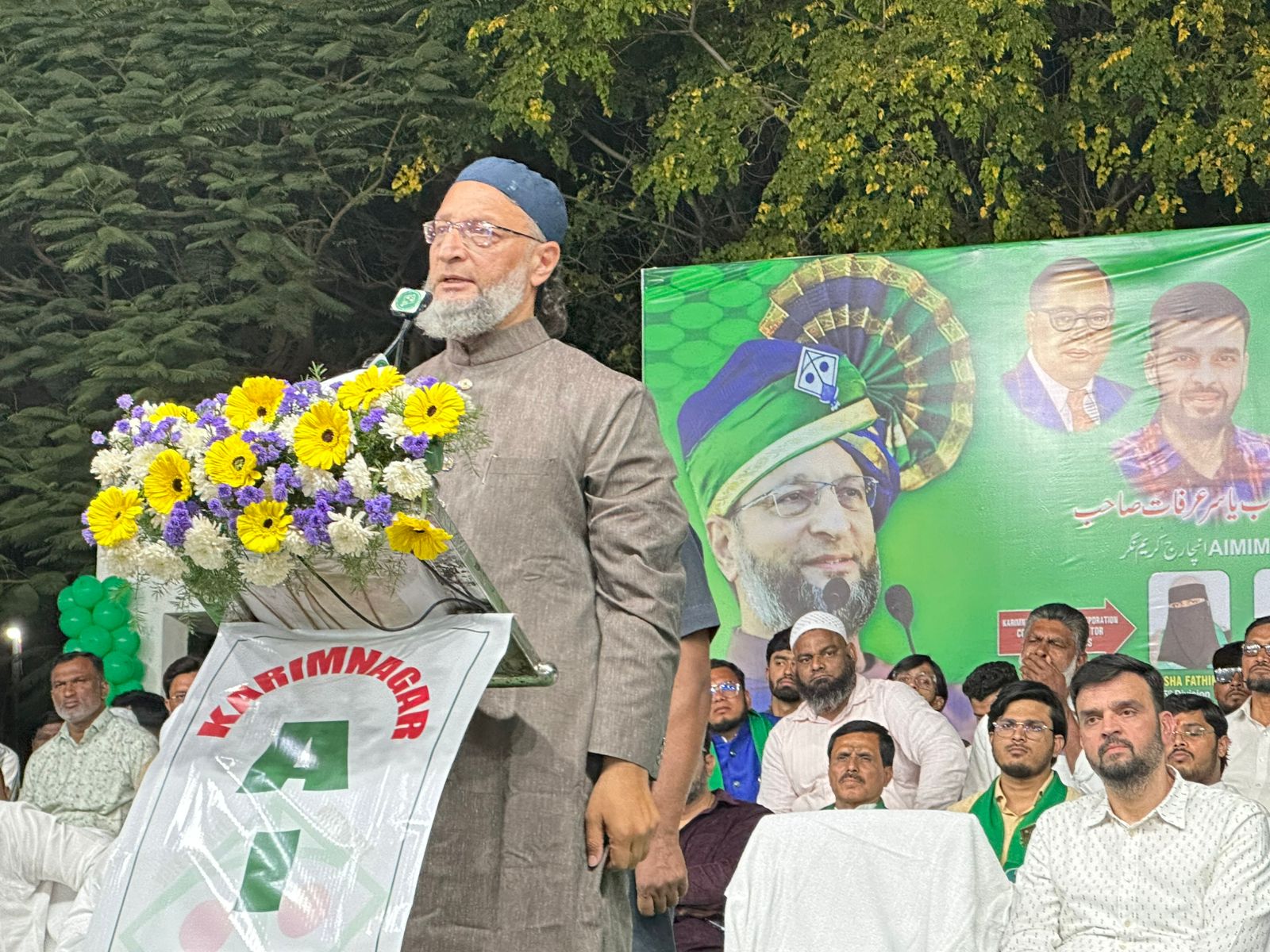 All India Majlis-e-Ittehadul Muslimeen President Barrister Asaduddin Owaisi addresses an election rally at Suraksh Ground, Karimnagar