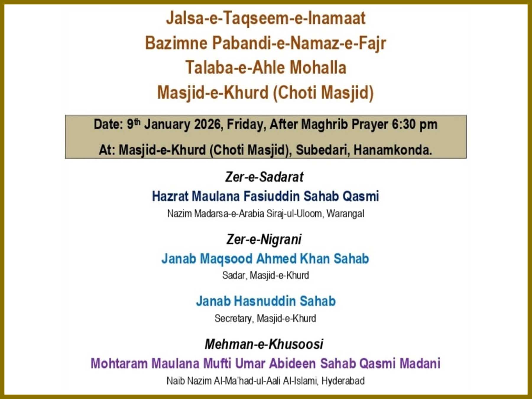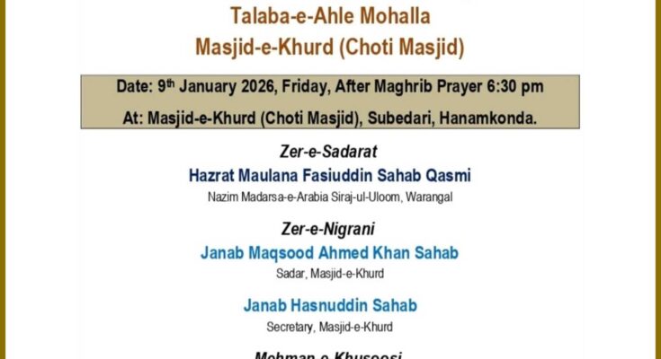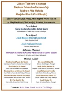 عبدالجلیل خان و نوجوانان چھوٹی مسجد صوبیداری ہنمکنڈہ کے زیرِ اہتمام پابندی نمازِ فجر مہم کے ضمن میں جلسہ تقسیم انعامات بتاریخ 9 جنوری بروز جمعہ بعد نمازِ مغرب بمقام مسجد خورد (چھوٹی مسجد) صوبیداری ہنمکنڈہ میں منعقد ہوگا۔اس پرُنور جلسہ کی صدارت حضرت مولانا فصیح الدین صاحب قاسمی فرمائیں گے، جبکہ نگرانی مقصود احمد خان (صدر مسجد ہذا) اور حسن الدین صاحب (معتمد مسجد ہذا) انجام دیں گے۔