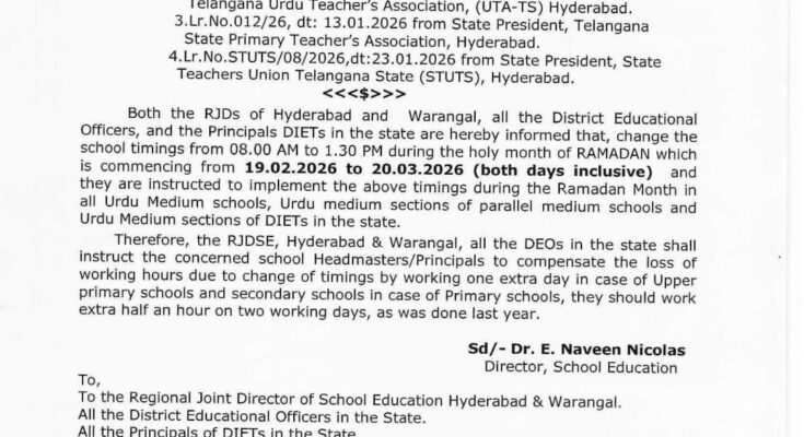 محکمہ تعلیم حکومت تیلنگانہ نے اپنے سرکاری حکم نامے کے ذریعے ہر سال کی طرح اس سال بھی رمضان المبارک میں اردو میڈیم اسکولز صبح کے وقت ہی کام کرنے کا اعلامیہ جاری کیا ۔