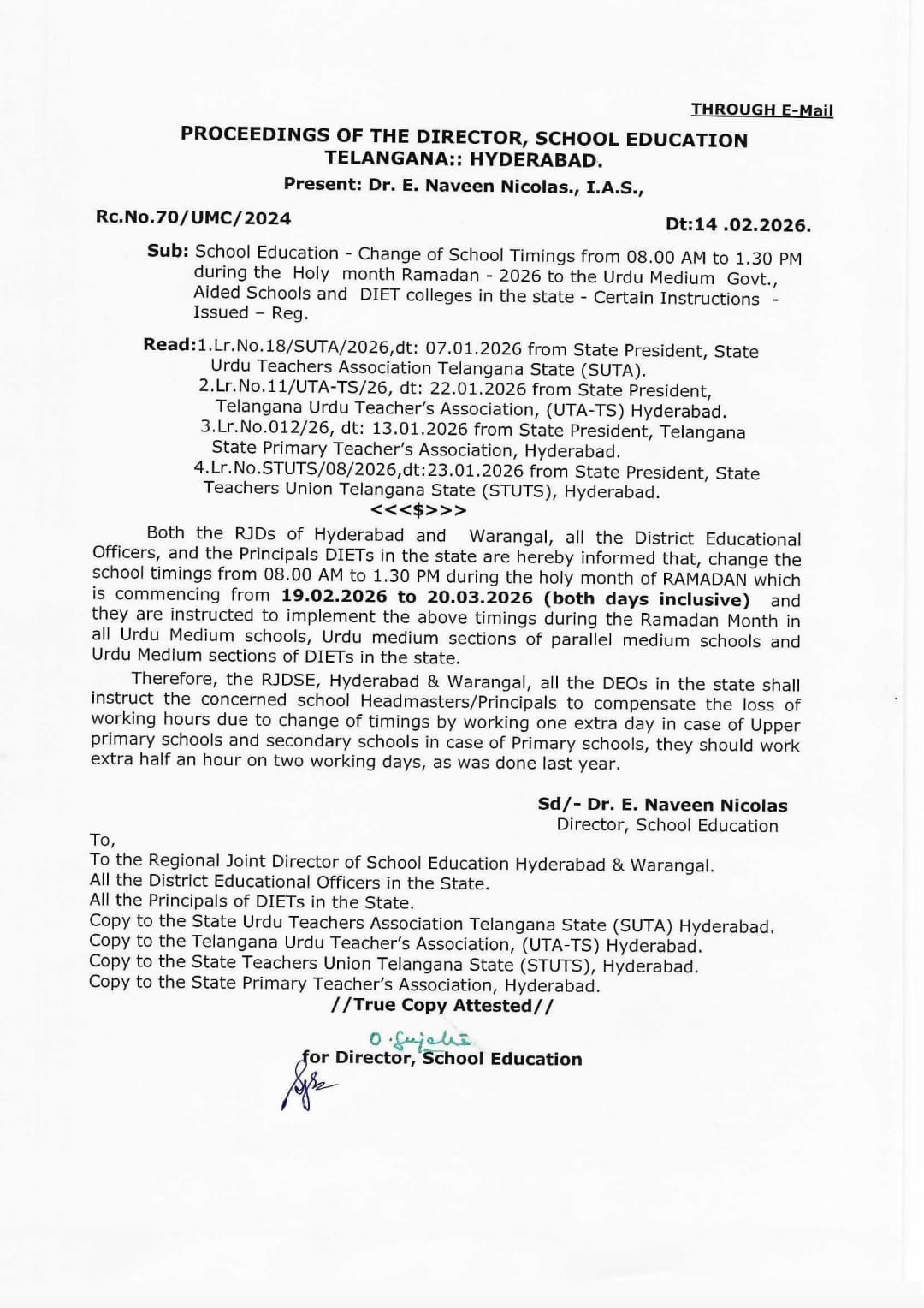 Change in working hours of Urdu medium schools during Ramadan on the representation of State Urdu Teachers Association, Telangana