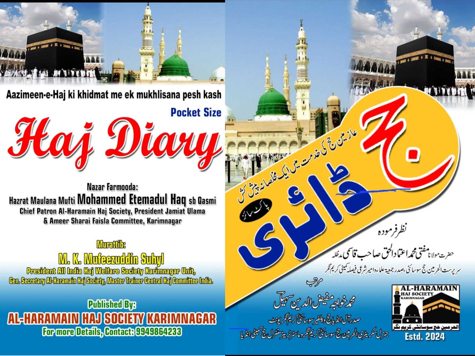 کریم نگر میں لبیک حج سوسائٹی کی جانب سےمنعقدہ عازمینِ حج کے تربیتی پروگرام کے دوران ریاستی حج کمیٹی کے چیئرمین الحاج غلام افضل بیابانی المعروف خسرو پاشاہ صاحب کے ہاتھوں اس پاکٹ حج ڈائری کی تقسیم عمل میں آئی۔یہ رہنما کتابچہ حضرت الحاج مولانا مفتی اعتماد الحق صاحب قاسمی، ناظم مدرسہ احسن العلوم و صدر جمعیۃ علماء کریم نگر کی نگرانی میں الحاج محمد خواجہ مفیض الدین سہیل، ماسٹر ٹرینر حج کمیٹی تلنگانہ و سیکرٹری الحرمین حج سوسائٹی نے مرتب کیا ہے۔