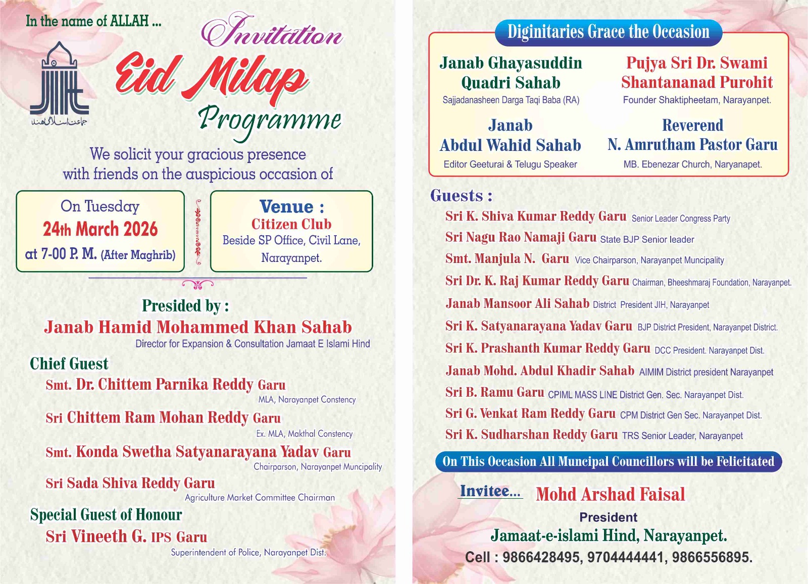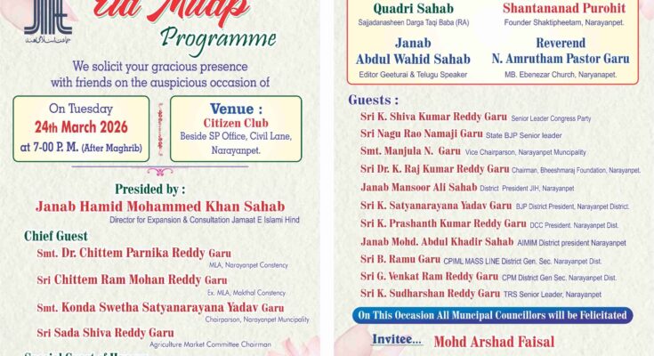 جناب محمد ارشد فیصل امیر مقامی جماعت اسلامی نارائن پیٹ کے پریس نوٹ کے بموجب جماعت اسلامی نارائن پیٹ کی جانب سے 24/ مارچ بروز منگل شام 7 بجے سٹی زنس کلب میں عید ملاپ پروگرام کا انعقاد عمل میں لایا جارہا ہے ۔