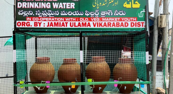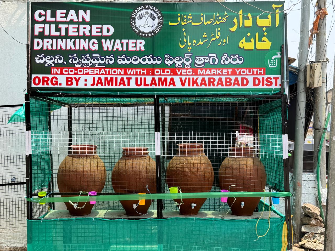گرمی کے موسم کو پیش نظر رکھتے ہوئے جمعیۃ علماء ضلع وقارآباد کی جانب سے ہر سال کی طرح اس سال بھی شہر کے مصروف علاقہ قدیم ترکاری بازار، نزد مسجد قریش میں ایک آب دار خانے کا افتتاح عمل میں لایا گیا، جہاں عوام کے لیے روزانہ ٹھنڈے، صاف اور فلٹر شدہ پانی کی فراہمی کا انتظام کیا گیا ہے۔