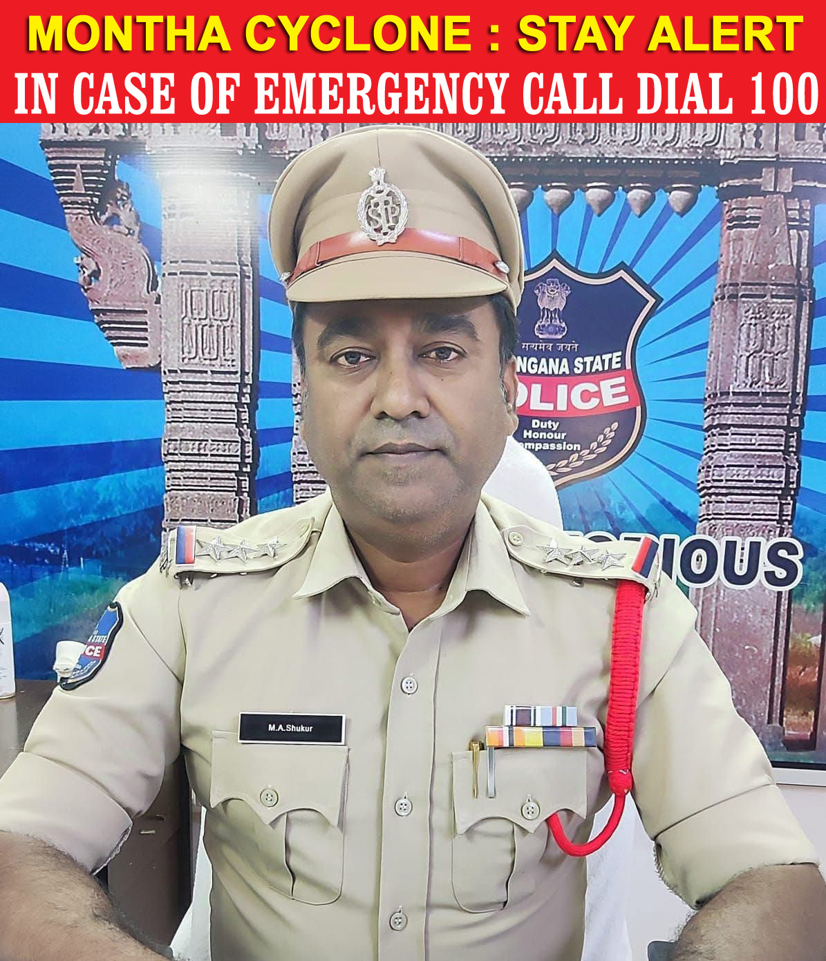 ورنگل انتظار گنج پولیس اسٹیشن کے سی آئی محمد عبدالشکور نے عوام سے اپیل کی ہے کہ مونتھا طوفان کی شدت کے پیش نظر ہر کوئی محتاط رہے۔ پولیس کے مطابق اس وقت دیہاتوں کے تالاب اور کنٹیاں پانی سے لبالب بھرے ہوئے ہیں، جس سے خطرناک صورتحال پیدا ہونے کا امکان ہے۔پولیس نے عوام کو تاکید کی کہ وہ کسی بھی صورت میں بہتے نالوں یا تالابوں کو عبور کرنے کی کوشش نہ کریں۔ سفر کے دوران سڑکوں پر موجود گڑھوں سے ہوشیار رہیں اور غیر ضروری طور پر گھروں سے باہر نہ نکلیں۔سی آئی محمد عبدالشکور نے کہا کہ عوام کی حفاظت پولیس کی ذمہ داری ہے، عوام اپنی جانوں کی حفاظت کریں اور صرف ہنگامی حالات میں ہی باہر نکلیں۔ کسی بھی ایمرجنسی کی صورت میں فوری طور پر ڈائل 100 پر اطلاع دیں۔پولیس نے اپنے پیغام میں کہا، “پولیس آپ کی خدمت کے لیے موجود ہے، آپ محفوظ رہیں۔”