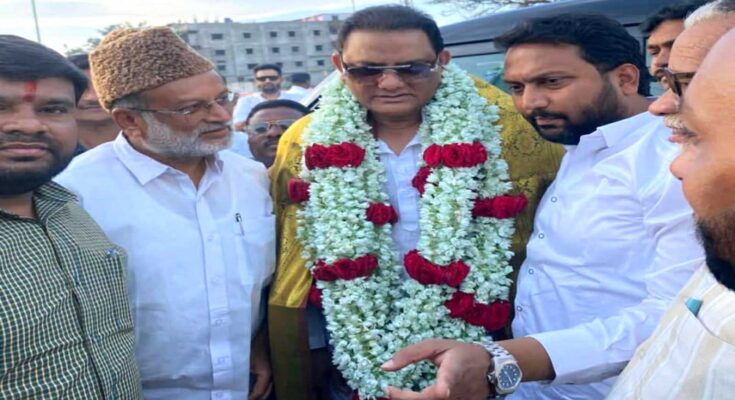 Telangana Minority Affairs Minister Mohammad Azharuddin was given a grand welcome