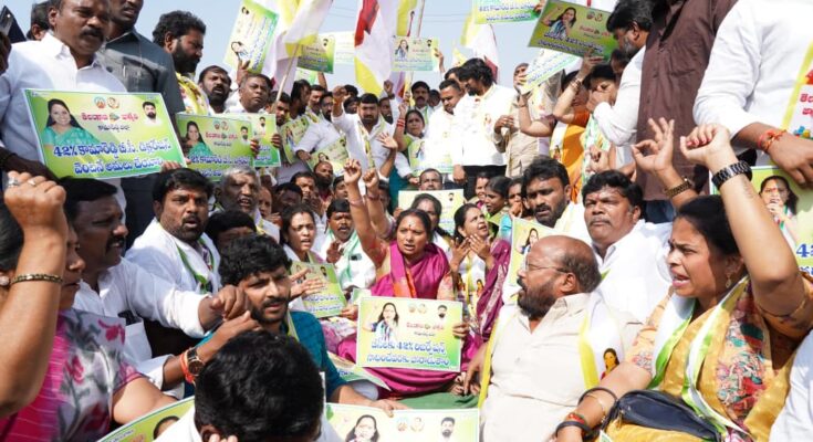 صدر تلنگانہ جاگروتی کلواکنٹلہ کویتا کو کاماریڈی میں ریل روکو احتجاج کے دوران پولیس کی جانب سے آج حراست میں لیا گیا۔ اس موقع پر میڈیا سے بات کرتے ہوئے کویتا نےواضح کیا کہ آج کا ریل روکو احتجاج صرف تلنگانہ ہی نہیں بلکہ دہلی تک ایک مضبوط پیغام پہنچانے کے لئے کیا گیا ہے۔ انہوں نے کہا کہ بی جے پی کو اپنی ہٹ دھرمی ترک کرنی ہوگی۔ بی جے پی کے اراکین پارلیمنٹ کو فوری طور پر استعفے دینا چاہئے اور بی سی برادری کے بچوں کو ان کا حق دلانے کے لئے مرکز پر دباؤ ڈالناہوگا۔ کویتا نے الزام عائد کیا کہ بی جے پی جان بوجھ کر بی سی برادری کے مفادات کے خلاف رکاوٹیں کھڑی کررہی ہے۔